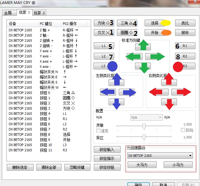 3、首先点亮手柄上的MODE键(有的手柄是ANALOG键),设置方法就是先点击右侧的按钮,然后在手柄上按下对应的键,下图设置对应标准的PS2手柄键位,建议这样设置,当然也可以根据你自己的喜好。